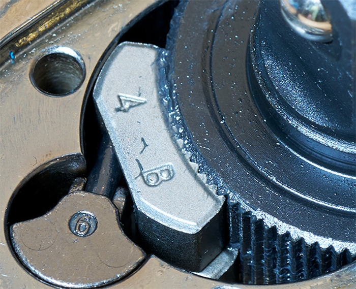 در صورتی که روکش و چرخ دنده آچار جغجغهای را از آن جدا کنیم، دو ضامن دندانهدار آچار نمایان میشوند.