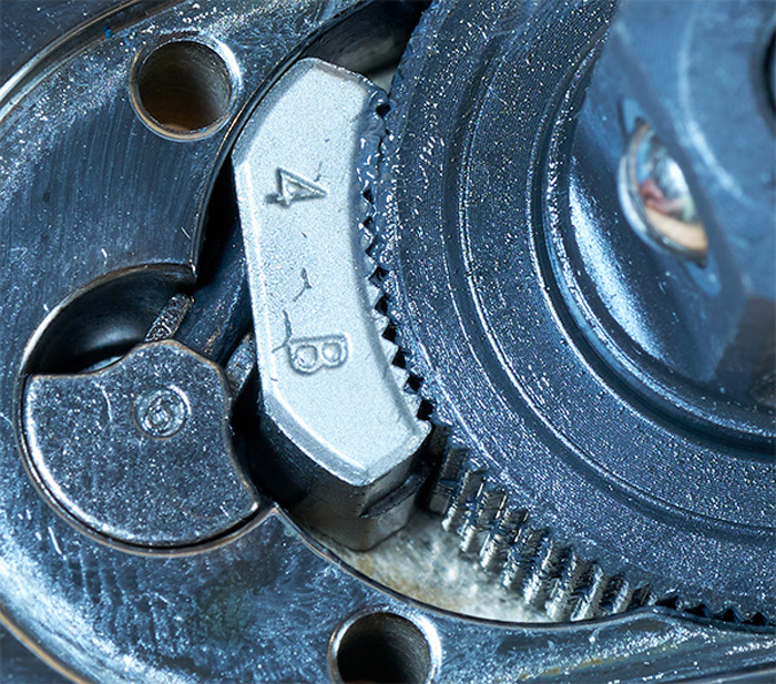 زمانی که یکی از ضامنها با چرخ دنده درگیر میشود، ضامن دیگر هیچ تماسی با چرخ دنده ندارد. اساساً دو ضامن به طور متناوب با چرخ دنده درگیر میشوند و در حالی که دندههای ضامن در راستای یکدیگر قرار ندارند، این تماس متناوب موجب میشود تا آچار جغجغهای مجهز به چرخدنده 90T، به طور موثری مانند چرخدنده 180T عمل کند. اگر آچار را به طور معکوس یک دور کامل بچرخانیم، صدای 180 کلیک را میشنویم که همین واقعیت را نشان میدهد.