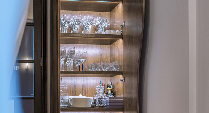این موضوع که آیا ظروف شیشهای در معرض دید ساکنین منزل قرار دارند یا پشت درب کابینت پنهان میشوند، یکی از فاکتورهایی است که باید در زمان تصمیمگیری برای انتخاب روش مناسب چیدن این ظروف در کابینت در نظر گرفته شود. عموماً از جنبه زیبایی شناسی توصیه میشود تا از فرم استاندارد برای چیدن ظروفی که در معرض دید افراد قرار دارند استفاده کنیم.
