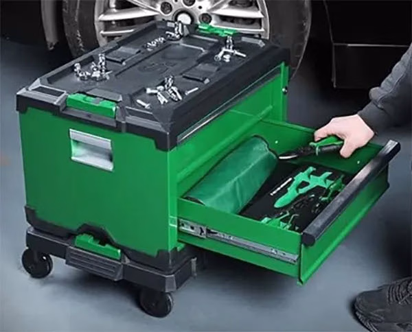 • سطح کار قالب‌گیری شده با شیارهای مخصوص نگهداری ابزار و پیچ و مهره