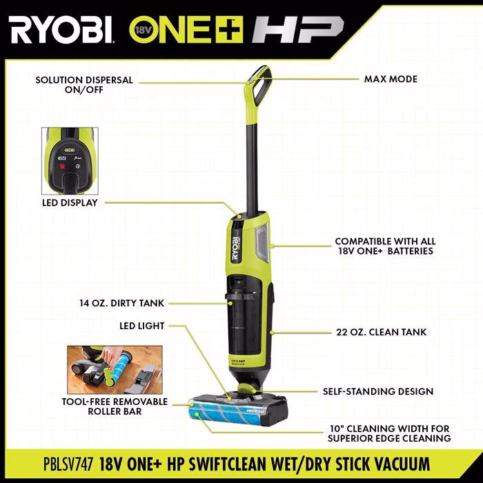 - قابلیت استفاده از باتری اضافی RYOBI 18V ONE+ برای تمیزکاری بدون وقفه