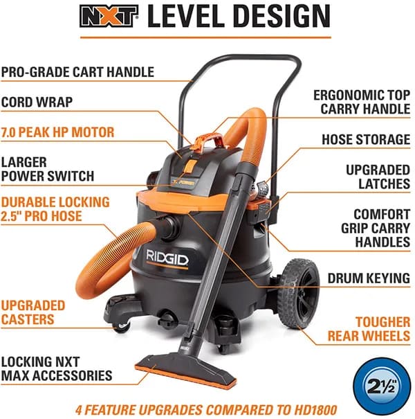 جاروبرقی کارگاهی مدل Ridgid HD1900، در مقایسه با مدل HD1800 که یک جاروبرقی کارگاهی قدرتمند محسوب می‌شود، قدرت بیشتری دارد و به شیلنگ بهتری نیز مجهز شده است. همچنین چرخ‌های عقب جاروبرقی که در مدل جدید بروزرسانی شده است، کاملاً محکم و پایدار به‌نظر می‌رسند.