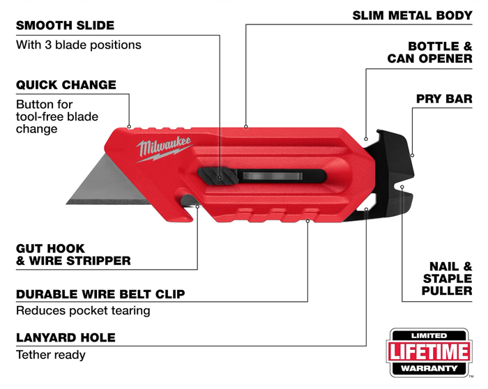 کاتر چند کاره میلواکی قابلیت تنظیم تیغه در 3 حالت مختلف را دارد و با اغلب تیغه‌های استاندارد موجود در بازار نیز سازگاری دارد. میله اهرمی که در بخش انتهایی کاتر قرار دارد، برای کشیدن میخ و منگنه و همچنین رفع نیاز کاربران به ابزاری برای خراشیدن و اهرم کردن طراحی شده است. در نگاه اول، یک شکاف اریب در پایین تیغه برش به چشم می‌خورد که احتمالاً برای بریدن و قطع کردن سیم برق، نخ یا طناب باریک کاربرد دارد. در پشت کاتر نیز یک گیره اتصال به لباس و یک درب بازکن قوطی وجود دارد.